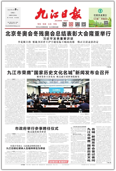 《九江日?qǐng)?bào)》是中共九江市委機(jī)關(guān)報(bào),創(chuàng)刊于1949年6月10日,1968年11月30日,由于受文化大革命的影響被迫?1982年7月1日復(fù)刊。1993年5月1日由4開(kāi)4版改為對(duì)開(kāi)4版,同時(shí)出版發(fā)行周末副刊《周末世界》(后改為《長(zhǎng)江周刊》)!毒沤?qǐng)?bào)》2003年1月開(kāi)始彩色印刷,現(xiàn)周二至周五為8版,周六至周一為4版。2009年的7月1日,以“權(quán)威、主流、服務(wù)、為民”為主旨進(jìn)行了全新改版。改報(bào)型為國(guó)際流行的“瘦報(bào)”。2009年10月成立《長(zhǎng)江周刊》編輯部,單獨(dú)出版《長(zhǎng)江周刊》(現(xiàn)為4開(kāi)16版,周五出版)。1996年10月創(chuàng)辦了《潯陽(yáng)晚報(bào)》,現(xiàn)為周六刊,周一至周五為4開(kāi)24版,周六為16個(gè)版。2006年7月創(chuàng)辦了九江新聞網(wǎng)(原九龍網(wǎng)),是九江市唯一一家被百度收錄為新聞源的網(wǎng)站,也是九江市唯一的新聞綜合門戶網(wǎng)站。2010年5月28日,又創(chuàng)辦了九江手機(jī)報(bào)。每天出版一期,每天上午8點(diǎn)30發(fā)出,本地新聞?wù)?0%,外地新聞?wù)?0%,生活類資訊占20%。2010年7月,以城市讀者為主流的月刊《城市月讀》創(chuàng)刊。作為《潯陽(yáng)晚報(bào)》深度閱讀和高度濃縮的高端讀本,《城市月讀》將依托九江日?qǐng)?bào)社這個(gè)九江市最大的傳媒機(jī)構(gòu),以內(nèi)容重構(gòu)為手段,聚焦城市發(fā)展,關(guān)注城市生活,審視城市人生,倡導(dǎo)城市時(shí)尚,建設(shè)城市生態(tài)。讓你在輕松之中瀏覽一個(gè)月來(lái)發(fā)生在九江這座城市的精彩,給你捧上一份的文化大餐。2007年底,投資近千萬(wàn)元的九江日?qǐng)?bào)社新聞彩印中心建成并投入使用。彩印中心占地23畝,建筑面積6300平方米。