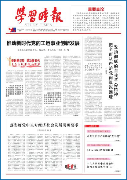 《學(xué)習(xí)時(shí)報(bào)》全面反映習(xí)近平總書記的成長歷程,相繼刊發(fā)《習(xí)近平的七年知青歲月》《習(xí)近平在正定》《習(xí)近平在寧德》《習(xí)近平在廈門》等系列采訪實(shí)錄,在黨內(nèi)外、國內(nèi)外產(chǎn)生廣泛而深刻的影響!秾W(xué)習(xí)時(shí)報(bào)》全面闡釋習(xí)近平新時(shí)代中國特色社會(huì)主義思想,相繼刊發(fā)《偉大思想理論從何而來》《偉大思想理論因何偉大》等重要理論文章,很好地發(fā)揮了黨的思想理論建設(shè)陣地和意識形態(tài)宣傳重要陣地作用。