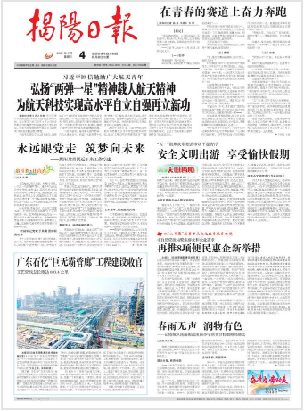 《揭陽(yáng)日?qǐng)?bào)》是中共揭陽(yáng)市委機(jī)關(guān)報(bào),創(chuàng)刊于1992年4月1日,對(duì)開(kāi)八版,周七刊,是一份由報(bào)社自辦發(fā)行的綜合性日?qǐng)?bào)!督谊(yáng)日?qǐng)?bào)》是一份由報(bào)社自辦發(fā)行的綜合性日?qǐng)?bào),刊號(hào)CN44-0033。