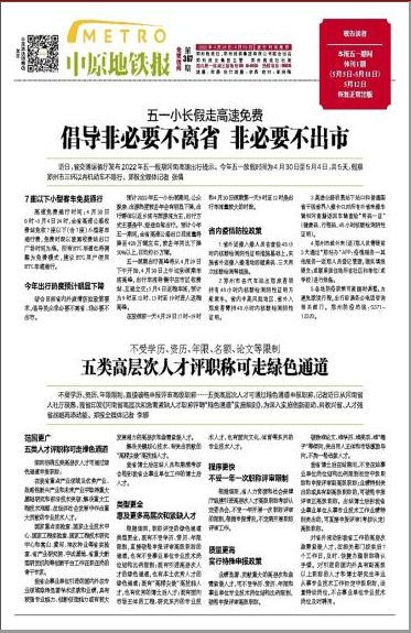 《中原地鐵報(bào)》是由鄭州報(bào)業(yè)集團(tuán)主管,鄭州晚報(bào)社與鄭州軌道交通有限公司聯(lián)合打造,作為鄭州地鐵唯一免費(fèi)讀本,創(chuàng)刊時(shí)就以時(shí)尚、資訊、實(shí)用為內(nèi)容定位,將與城市生活息息相關(guān)的各種元素納入其中,秉承“地道生活、快意閱讀”的理念,有趣有味有意思,已經(jīng)成為地鐵內(nèi)最具消費(fèi)力群里白領(lǐng)一族新聞信息和生活資訊的來(lái)源。獨(dú)占優(yōu)質(zhì)地鐵媒體渠道,覆蓋鄭州地鐵一號(hào)線、二號(hào)線,每周四起派發(fā)5天。
