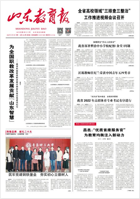 《山東教育報(bào)》由山東省教育廳主管、山東教育社主辦,創(chuàng)刊于1993年,2000年更名為《現(xiàn)代教育導(dǎo)報(bào)》,2010年恢復(fù)為《山東教育報(bào)》。在2006年、2007年度新聞出版總署組織的全國教育類報(bào)紙質(zhì)量檢測中名列第二,在2008年度檢測中與《中國教師報(bào)》并列第一,被新聞出版總署認(rèn)定為2009、2010年度質(zhì)量免檢報(bào)紙。被評(píng)為歷屆山東省優(yōu)秀報(bào)紙。