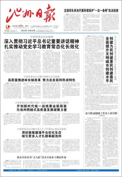 《池州日報》,1969年1月1日創(chuàng)刊,是中共池州市委機關(guān)報,在全省市級黨報中是出報較多的一張報紙!冻刂萑請蟆肥侵泄渤刂菔形瘷C關(guān)報,創(chuàng)刊于1969年1月1日,現(xiàn)為對開四版彩色大報,每周出版十一張報紙,其中,星期一至星期五為正報,星期六為周末刊《九華周刊》,星期日為《財經(jīng)周刊》,周三為《教育周刊》,每周三還出版《池州日報·貴池新聞》,周二出版《池州日報·東至新聞》,周四出版《池州日報·青陽新聞》,在全省市級黨報中是出報較多的一張報紙。