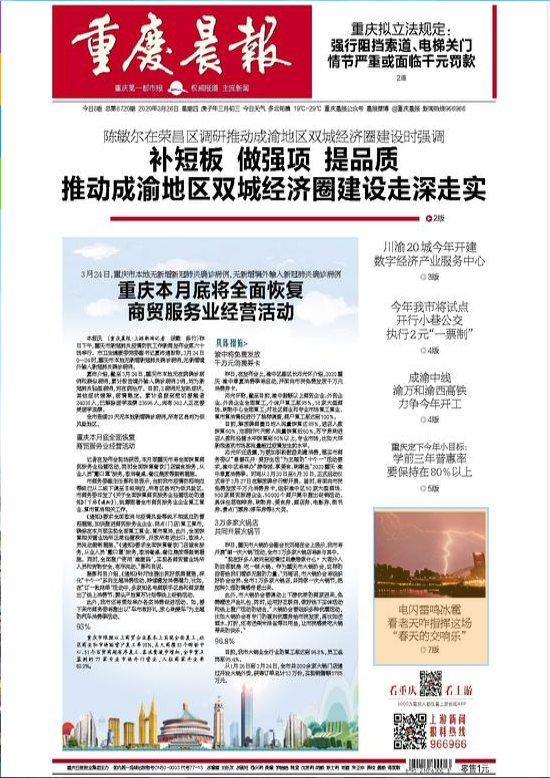 《重慶晨報》經(jīng)國家新聞出刊署同意興辦,由中共重慶市委宣傳部主管,重慶日報報業(yè)集團主辦,通過21年開展,《重慶晨報》以全國新聞盡在手中為理念,以主城區(qū)零售發(fā)行為主,并全面輻射周邊區(qū)域的優(yōu)秀結構為根底,不斷引領重慶早報行業(yè)潮流,創(chuàng)始多項榜首:發(fā)行量榜首;廣告收入榜首;發(fā)行量已每日過50萬份。