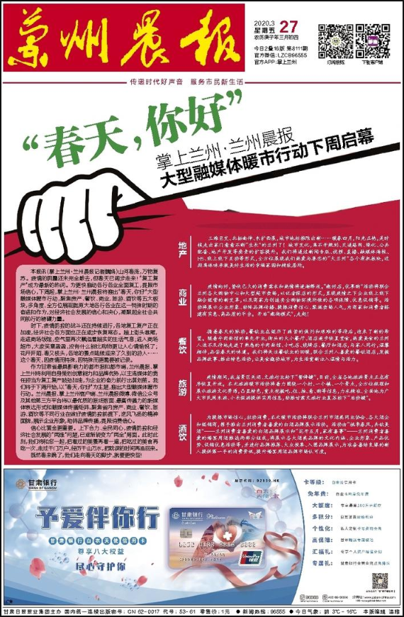 《蘭州晨報(bào)》強(qiáng)調(diào)服務(wù)性、可讀性、時(shí)效性、權(quán)威性。全方位報(bào)道市民關(guān)心的政治、經(jīng)濟(jì)、社會(huì)、文化、體育等多個(gè)領(lǐng)域的內(nèi)容,解析時(shí)事政策,提供服務(wù)信息,引導(dǎo)消費(fèi)潮流,融新聞性與服務(wù)性于一體。通過全心全意地替市民分憂、為政府解難,通過切實(shí)有效的輿論監(jiān)督、反映市民要求,并積極倡導(dǎo)公益精神組織策劃各類公益活動(dòng),在廣大市民中樹立起“主流、權(quán)威、親和”的媒體形象。