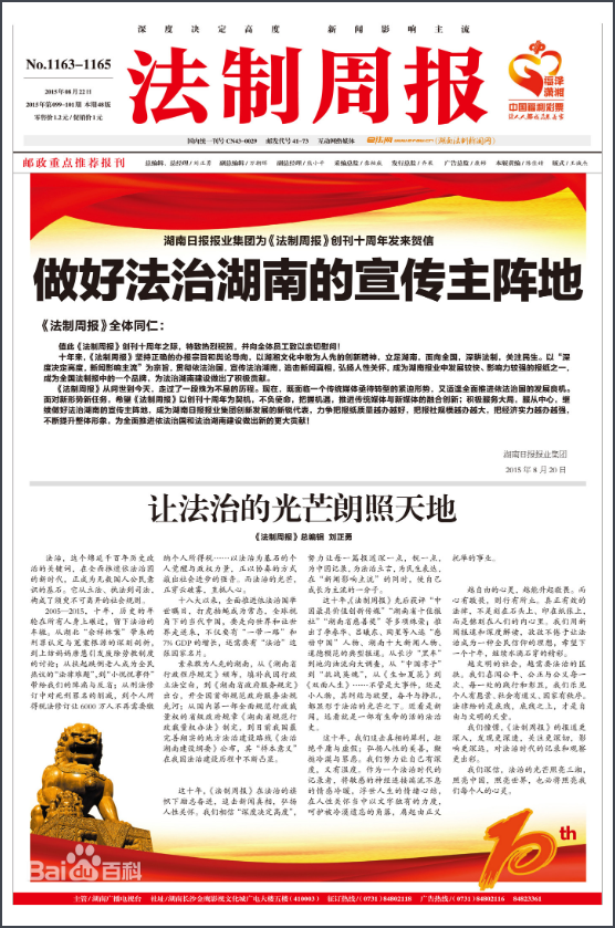 如今,《法制周報(bào)》作為“中國(guó)最具影響力的法制類新聞周報(bào)”的地位初步確立,面向全國(guó),植根三湘,已成為法治湖南建設(shè)宣傳的主要窗口。