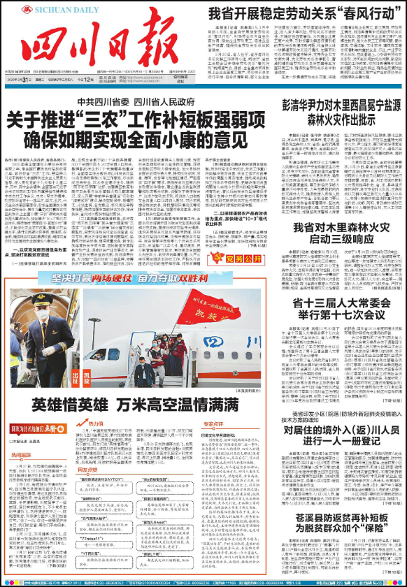 2019年3月21日,《四川日報》獲得由人民日報全國黨媒信息公共平臺與中國平安聯(lián)合發(fā)起的“村暖花開·鄉(xiāng)村扶貧扶志典型人物”評選活動“全國黨媒優(yōu)秀扶貧報道”獎項 。