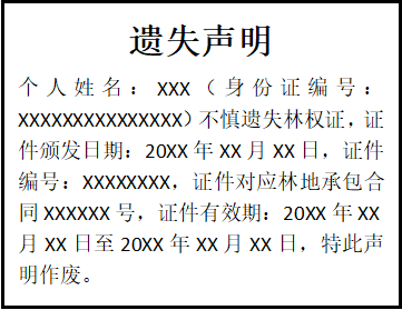 個人姓名:XXX(身份證編號:XXXXXXXXXXXXXXX)不慎遺失林權(quán)證,證件頒發(fā)日期:20XX年XX月XX日,證件編號:XXXXXXXX,證件對應(yīng)林地承包合同XXXXXX號,證件有效期:20XX年XX月XX日至20XX年XX月XX日,特此聲明作廢。