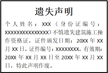 個人姓名:XXX(身份證編號:XXXXXXXXXXXXXXX)不慎遺失建筑施工操作資格證,證件頒發(fā)日期:20XX年XX月XX日,證件編號:XXXXXXXX,有效期:20XX年XX月XX日至20XX年XX月XX日,特此聲明作廢。