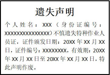 個(gè)人姓名:XXX(身份證編號(hào):XXXXXXXXXXXXXXX)不慎遺失特種作業(yè)人員證,證件頒發(fā)日期:20XX年XX月XX日,證件編號(hào):XXXXXXXX,有效期:20XX年XX月XX日至20XX年XX月XX日,特此聲明作廢。