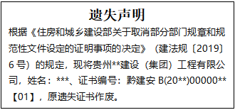 根據(jù)《住房和城鄉(xiāng)建設(shè)部關(guān)于取消部分部門規(guī)章和規(guī)范性文件設(shè)定的證明事項(xiàng)的決定》(建法規(guī)〔2019〕6號(hào))的規(guī)定,現(xiàn)將貴州**建設(shè)(集團(tuán))工程有限公司,姓名:***、證書編號(hào):黔建安B(20**)00000**【01】,原遺失證書作廢。