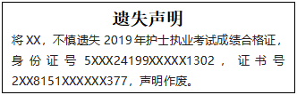 將XX,不慎遺失2019年護士執(zhí)業(yè)考試成績合格證,身份證號5XXX24199XXXXX1302,證書號2XX8151XXXXXX377,聲明作廢。
