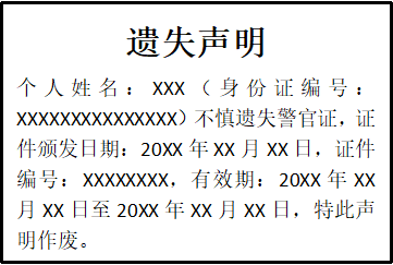 個人姓名:XXX(身份證編號:XXXXXXXXXXXXXXX)不慎遺失警官證,證件頒發(fā)日期:20XX年XX月XX日,證件編號:XXXXXXXX,有效期:20XX年XX月XX日至20XX年XX月XX日,特此聲明作廢。
