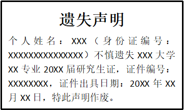 個人姓名:XXX(身份證編號:XXXXXXXXXXXXXXX)不慎遺失XXX大學(xué)XX專業(yè)20XX屆研究生證,證件編號:XXXXXXXX,證件出具日期:20XX年XX月XX日,特此聲明作廢。