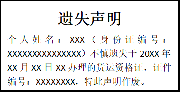個人姓名:XXX(身份證編號:XXXXXXXXXXXXXXX)不慎遺失于20XX年XX月XX日XX辦理的貨運資格證,證件編號:XXXXXXXX,特此聲明作廢。