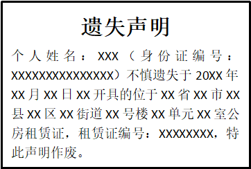 個(gè)人姓名:XXX(身份證編號(hào):XXXXXXXXXXXXXXX)不慎遺失于20XX年XX月XX日XX開具的位于XX省XX市XX縣XX區(qū)XX街道XX號(hào)樓XX單元XX室公房租賃證,租賃證編號(hào):XXXXXXXX,特此聲明作廢。
