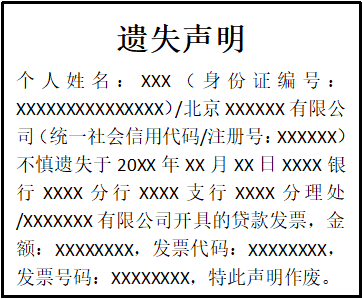 個(gè)人姓名:XXX(身份證編號(hào):XXXXXXXXXXXXXXX)/北京XXXXXX有限公司(統(tǒng)一社會(huì)信用代碼/注冊(cè)號(hào):XXXXXX)不慎遺失于20XX年XX月XX日XXXX銀行XXXX分行XXXX支行XXXX分理處/XXXXXXX有限公司開具的貸款發(fā)票,金額:XXXXXXXX,發(fā)票代碼:XXXXXXXX,發(fā)票號(hào)碼:XXXXXXXX,特此聲明作廢。