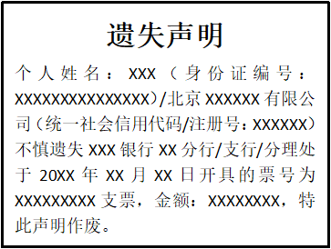 個人姓名:XXX(身份證編號:XXXXXXXXXXXXXXX)/北京XXXXXX有限公司(統(tǒng)一社會信用代碼/注冊號:XXXXXX)不慎遺失XXX銀行XX分行/支行/分理處于20XX年XX月XX日開具的票號為XXXXXXXXX支票,金額:XXXXXXXX,特此聲明作廢。