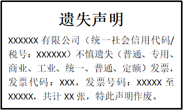 XXXXXX有限公司(統(tǒng)一社會信用代碼/稅號:XXXXXX)不慎遺失(普通、專用、商業(yè)、工業(yè)、統(tǒng)一、普通、定額)發(fā)票,發(fā)票代碼:XXX,發(fā)票號碼:XXXXX至XXXXX,共計XX張,特此聲明作廢。