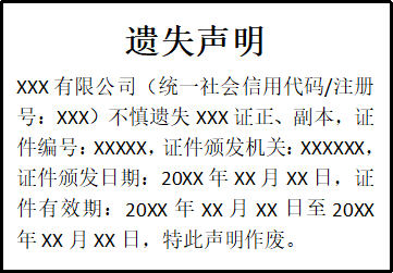 XXX有限公司(統(tǒng)一社會(huì)信用代碼/注冊(cè)號(hào):XXX)不慎遺失XXX證正、副本,證件編號(hào):XXXXX,證件頒發(fā)機(jī)關(guān):XXXXXX,證件頒發(fā)日期:20XX年XX月XX日,證件有效期:20XX年XX月XX日至20XX年XX月XX日,特此聲明作廢。