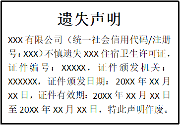 XXX有限公司(統(tǒng)一社會(huì)信用代碼/注冊(cè)號(hào):XXX)不慎遺失XXX住宿衛(wèi)生許可證,證件編號(hào):XXXXX,證件頒發(fā)機(jī)關(guān):XXXXXX,證件頒發(fā)日期:20XX年XX月XX日,證件有效期:20XX年XX月XX日至20XX年XX月XX日,特此聲明作廢。
