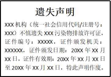 XXX機(jī)構(gòu)(統(tǒng)一社會(huì)信用代碼/注冊(cè)號(hào):XXX)不慎遺失XXX污染物排放許可證,證件編號(hào):XXXXX,證件頒發(fā)機(jī)關(guān):XXXXXX,證件頒發(fā)日期:20XX年XX月XX日,證件有效期:20XX年XX月XX日至20XX年XX月XX日,特此聲明作廢。
