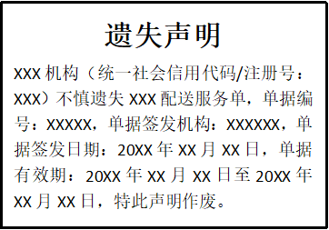 XXX機(jī)構(gòu)(統(tǒng)一社會(huì)信用代碼/注冊(cè)號(hào):XXX)不慎遺失XXX配送服務(wù)單,單據(jù)編號(hào):XXXXX,單據(jù)簽發(fā)機(jī)構(gòu):XXXXXX,單據(jù)簽發(fā)日期:20XX年XX月XX日,單據(jù)有效期:20XX年XX月XX日至20XX年XX月XX日,特此聲明作廢。