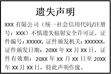 XXX有限公司(統(tǒng)一社會信用代碼/注冊號:XXX)不慎遺失輻射安全許可證,證件編號:XXXXX,證件頒發(fā)機(jī)關(guān):XXXXXX,證件頒發(fā)日期:20XX年XX月XX日,證件有效期:20XX年XX月XX日至20XX年XX月XX日,特此聲明作廢。