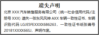 北京XXX汽車銷售服務(wù)有限公司(統(tǒng)一社會信用代碼/注冊號XXX)遺失一張東風(fēng)風(fēng)神AXX車輛一致性證書,車輛識別代碼LGJE5FEXXXX686263,一致性證書紙張編號20181XXXX66SJ,聲明作廢。