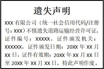 XXX有限公司(統(tǒng)一社會(huì)信用代碼/注冊(cè)號(hào):XXX)不慎遺失道路運(yùn)輸經(jīng)營(yíng)許可證,證件編號(hào):XXXXX,證件頒發(fā)機(jī)關(guān):XXXXXX,證件頒發(fā)日期:20XX年XX月XX日,證件有效期:20XX年XX月XX日至20XX年XX月XX日,特此聲明作廢。