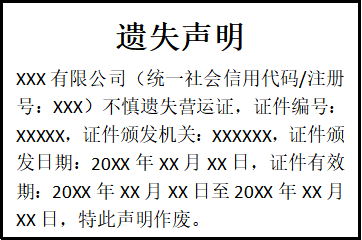 XXX有限公司(統(tǒng)一社會信用代碼/注冊號:XXX)不慎遺失營運(yùn)證,證件編號:XXXXX,證件頒發(fā)機(jī)關(guān):XXXXXX,證件頒發(fā)日期:20XX年XX月XX日,證件有效期:20XX年XX月XX日至20XX年XX月XX日,特此聲明作廢。