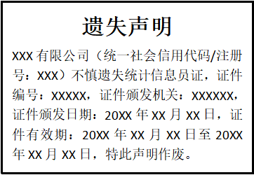 XXX有限公司(統(tǒng)一社會信用代碼/注冊號:XXX)不慎遺失統(tǒng)計信息員證,證件編號:XXXXX,證件頒發(fā)機關(guān):XXXXXX,證件頒發(fā)日期:20XX年XX月XX日,證件有效期:20XX年XX月XX日至20XX年XX月XX日,特此聲明作廢。