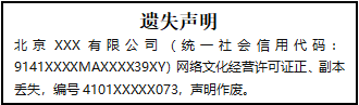 北京XXX有限公司(統(tǒng)一社會(huì)信用代碼:9141XXXXMAXXXX39XY)網(wǎng)絡(luò)文化經(jīng)營(yíng)許可證正、副本丟失,編號(hào)4101XXXXX073,聲明作廢。