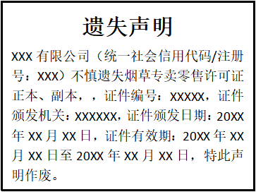 XXX有限公司(統(tǒng)一社會(huì)信用代碼/注冊(cè)號(hào):XXX)不慎遺失煙草專賣零售許可證正本、副本,,證件編號(hào):XXXXX,證件頒發(fā)機(jī)關(guān):XXXXXX,證件頒發(fā)日期:20XX年XX月XX日,證件有效期:20XX年XX月XX日至20XX年XX月XX日,特此聲明作廢。