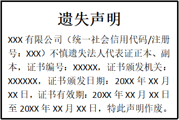 XXX有限公司(統(tǒng)一社會(huì)信用代碼/注冊(cè)號(hào):XXX)不慎遺失法人代表證正本、副本,證書編號(hào):XXXXX,證書頒發(fā)機(jī)關(guān):XXXXXX,證書頒發(fā)日期:20XX年XX月XX日,證書有效期:20XX年XX月XX日至20XX年XX月XX日,特此聲明作廢。