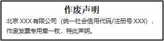 北京XXX有限公司(統(tǒng)一社會(huì)信用代碼/注冊(cè)號(hào)XXX),作廢發(fā)票專用章一枚,特此聲明。