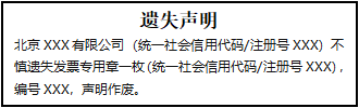 北京XXX有限公司(統(tǒng)一社會(huì)信用代碼/注冊(cè)號(hào)XXX)不慎遺失發(fā)票專用章一枚(統(tǒng)一社會(huì)信用代碼/注冊(cè)號(hào)XXX),編號(hào)XXX,聲明作廢。