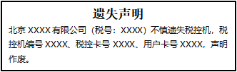 北京XXXX有限公司(稅號(hào):XXXX)不慎遺失稅控機(jī),稅控機(jī)編號(hào)XXXX、稅控卡號(hào)XXXX、用戶卡號(hào)XXXX,聲明作廢。