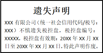 XXX有限公司(統(tǒng)一社會(huì)信用代碼/稅號(hào):XXX)不慎遺失稅控盤,稅控盤編號(hào):XXXXX,稅控盤有效期:20XX年XX月XX日至20XX年XX月XX日,特此聲明作廢。