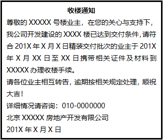 尊敬的XXXXX號(hào)樓業(yè)主,在您的關(guān)心與支持下,我公司開發(fā)建設(shè)的XXXX樓已達(dá)到交付條件,請(qǐng)符合201X年X月X日精裝交付批次的業(yè)主于201X年X月XX日至XX日攜帶相關(guān)證件及材料到XXXXX辦理收樓手續(xù)。