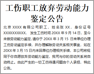 北京XXXX有限公司職工,姓名張XX,身份證號XXXXXXXXXX, 發(fā)生工傷時間20XX年9月14日,至今未做勞動能力鑒定,請你于20XX年3月15 日來單位辦理工傷勞動鑒定手續(xù),并辦理解除勞動關(guān)系相關(guān)事宜,如在20XX年3月15日內(nèi)未回單位辦理相關(guān)手續(xù),本公司將視同于你自愿放棄勞動能力鑒定,我司與你的勞動關(guān)系將自動終止。由此產(chǎn)生的一切工傷待遇問題由個人承擔,特此公告。