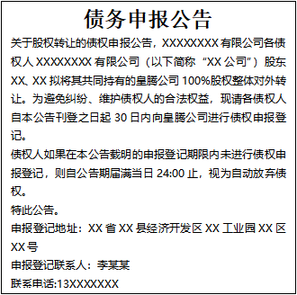 關(guān)于股權(quán)轉(zhuǎn)讓的債權(quán)申報公告,XXXXXXXX有限公司各債權(quán)人XXXXXXXX有限公司(以下簡稱“XX公司”)股東XX、XX擬將其共同持有的皇騰公司100%股權(quán)整體對外轉(zhuǎn)讓。為避免糾紛、維護債權(quán)人的合法權(quán)益,現(xiàn)請各債權(quán)人自本公告刊登之日起30日內(nèi)向皇騰公司進(jìn)行債權(quán)申報登記。