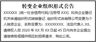 XXXXXX(統(tǒng)一社會信用代碼/注冊號XXX)擬向企業(yè)登記機關(guān)申請組織形式轉(zhuǎn)換登記,組織形式由有限公司變更為個人獨資企業(yè),名稱變更為:XXXXXXXX,法定代表人XX,請債權(quán)人自2020年XX月XX日起45日內(nèi)向本企業(yè)提出清償債務(wù)或提供相應(yīng)的擔保請求,特此公告。