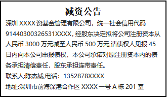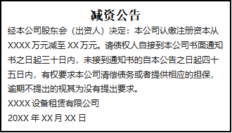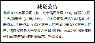 減資公告:北京XXX有限公司(統(tǒng)一社會(huì)信用代碼XXX)經(jīng)股東/股東會(huì)/董事會(huì)(決定/決議),擬向公司登記機(jī)關(guān)申請(qǐng)減少注冊(cè)資本,注冊(cè)資本由XXX萬(wàn)元人民幣減少至XXX萬(wàn)元人民幣,請(qǐng)債權(quán)債務(wù)人于見(jiàn)報(bào)之日起45日內(nèi)向本公司提出債權(quán)債務(wù)或提供相應(yīng)的擔(dān)保請(qǐng)求,特此公告。