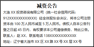 減資公告:大連XX投資咨詢(xún)有限公司(統(tǒng)一社會(huì)信用代碼:912XXXXXXXXXXXX)經(jīng)全體股東會(huì)決議,將本公司注冊(cè)資本由100萬(wàn)人民幣減至5萬(wàn)人民幣。債權(quán)人自本公告刊登之日起45日內(nèi),有權(quán)要求本公司清償債務(wù),特此公告。
