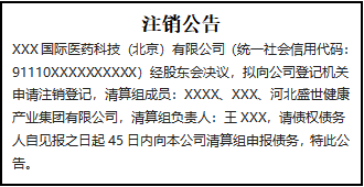 注銷公告:XXX國(guó)際醫(yī)藥科技(北京)有限公司(統(tǒng)一社會(huì)信用代碼:91110XXXXXXXXXX)經(jīng)股東會(huì)決議,擬向公司登記機(jī)關(guān)申請(qǐng)注銷登記,清算組成員:XXXX、XXX、河北盛世健康產(chǎn)業(yè)集團(tuán)有限公司,清算組負(fù)責(zé)人:王XXX,請(qǐng)債權(quán)債務(wù)人自見報(bào)之日起45日內(nèi)向本公司清算組申報(bào)債務(wù),特此公告。