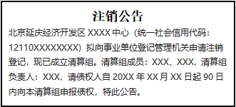 注銷公告:北京延慶經(jīng)濟(jì)開發(fā)區(qū)XXXX中心(統(tǒng)一社會(huì)信用代碼:12110XXXXXXXX)擬向事業(yè)單位登記管理機(jī)關(guān)申請(qǐng)注銷登記,現(xiàn)已成立清算組。清算組成員:XXX、XXX,清算組負(fù)責(zé)人:XXX,請(qǐng)債權(quán)人自20XX年XX月XX日起90日內(nèi)向本清算組申報(bào)債權(quán),特此公告。