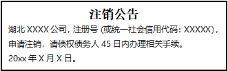 注銷公告:湖北XXXX公司,注冊(cè)號(hào)(或統(tǒng)一社會(huì)信用代碼:XXXXX),申請(qǐng)注銷,請(qǐng)債權(quán)債務(wù)人45日內(nèi)辦理相關(guān)手續(xù)。