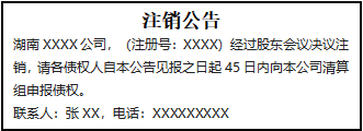 注銷公告:湖南XXXX公司,(注冊(cè)號(hào):XXXX)經(jīng)過(guò)股東會(huì)議決議注銷,請(qǐng)各債權(quán)人自本公告見報(bào)之日起45日內(nèi)向本公司清算組申報(bào)債權(quán)。