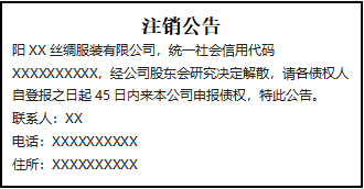 注銷公告:沈陽(yáng)XX絲綢服裝有限公司,統(tǒng)一社會(huì)信用代碼XXXXXXXXXX,經(jīng)公司股東會(huì)研究決定解散,請(qǐng)各債權(quán)人自登報(bào)之日起45日內(nèi)來(lái)本公司申報(bào)債權(quán),特此公告。