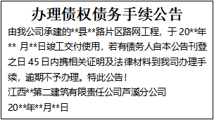 由我公司承建的**縣**路片區(qū)路網(wǎng)工程,于20**年** 月**日竣工交付使用,若有債務(wù)人自本公告刊登之日45日內(nèi)攜相關(guān)證明及法律材料到我司辦理手續(xù),逾期不予辦理。特此公告!